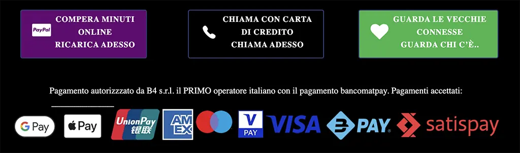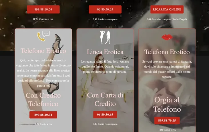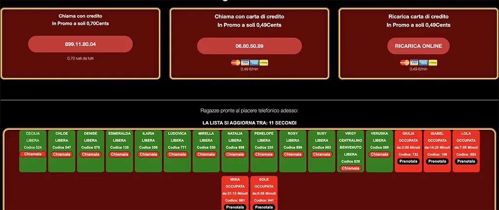 - Tariffe trasparenti: Da 0,49€/min IVA inclusa con carta, o 0,77€/min + IVA via 899 per telefono erotico a basso costo.