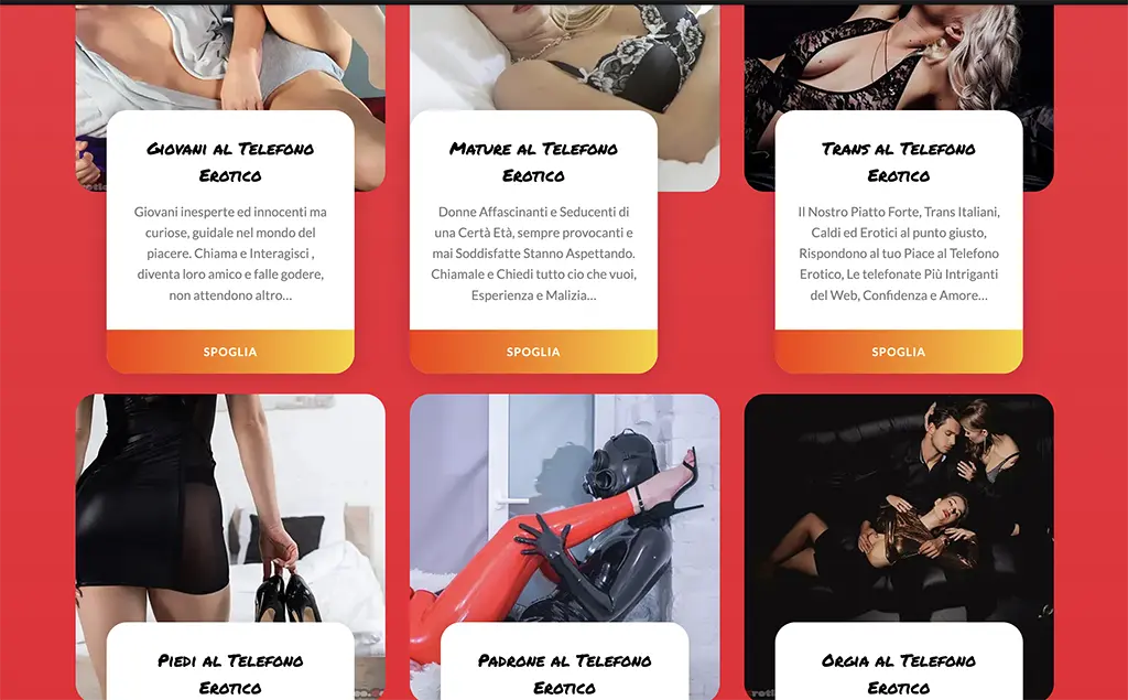 Il portale eccelle in varietà e qualità: dal classico telefono erotico a specialità come milf al telefono erotico o orgia al telefono erotico. Accesso facile, prezzi bassi, privacy totale. Operatrici sempre disponibili, sito sicuro e fluido.